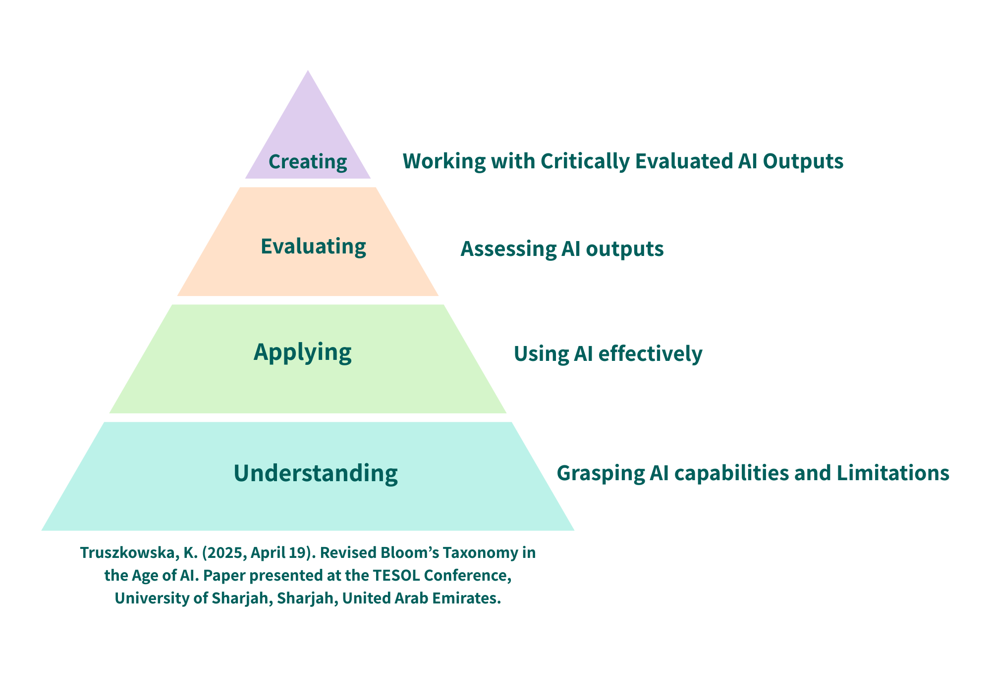 At the TESOL Conference at the University of Sharjah this year, I presented a framework grounded in Bloom’s Taxonomy that integrates AI literacy into essay writing instruction. It works in four progressive stages.